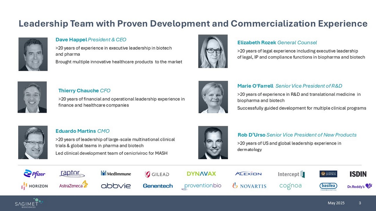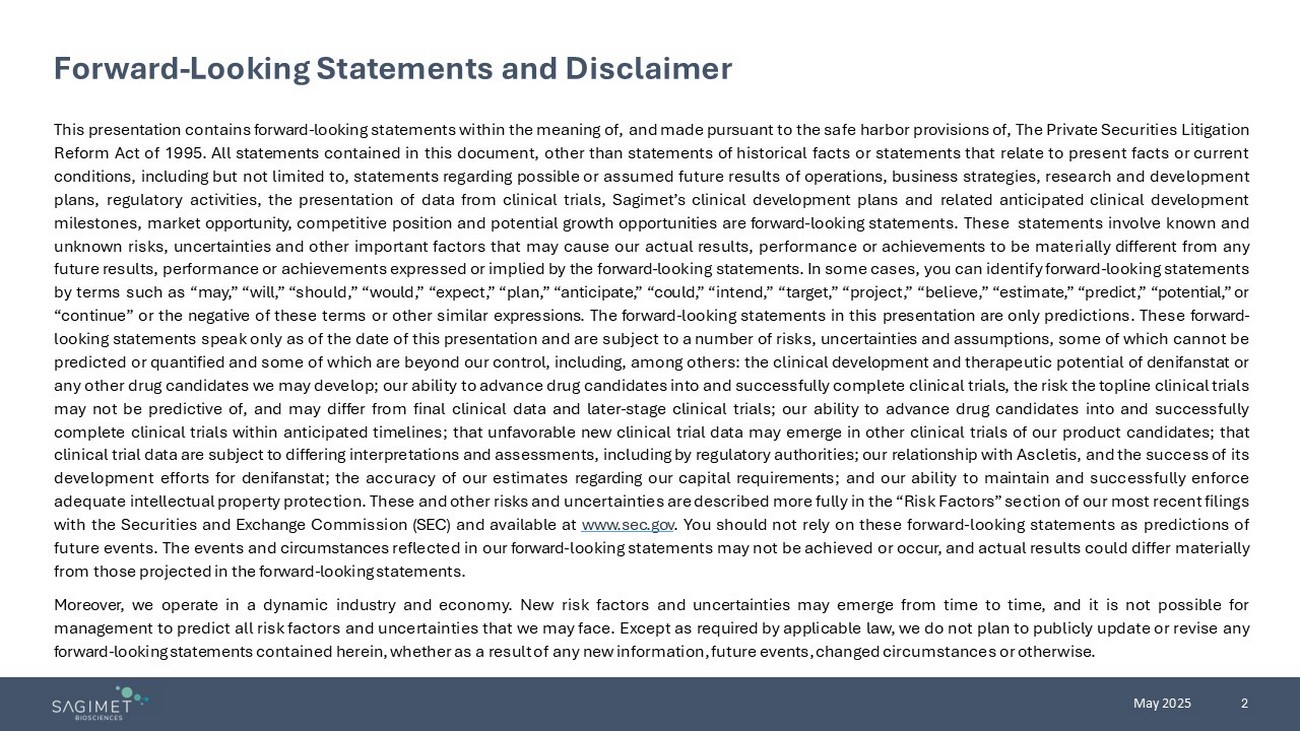 2 May 2025 Forward - Looking Statements and Disclaimer This presentation contains forward - looking statements within the meaning of, and made pursuant to the safe harbor provisions of, The Private Securities Litigation Reform Act of 1995 . All statements contained in this document, other than statements of historical facts or statements that relate to present facts or current conditions, including but not limited to, statements regarding possible or assumed future results of operations, business strategies, research and development plans, regulatory activities, the presentation of data from clinical trials, Sagimet’s clinical development plans and related anticipated clinical development milestones, market opportunity, competitive position and potential growth opportunities are forward - looking statements . These statements involve known and unknown risks, uncertainties and other important factors that may cause our actual results, performance or achievements to be materially different from any future results, performance or achievements expressed or implied by the forward - looking statements . In some cases, you can identify forward - looking statements by terms such as “may,” “will,” “should,” “would,” “expect,” “plan,” “anticipate,” “could,” “intend,” “target,” “project,” “believe,” “estimate,” “predict,” “potential,” or “continue” or the negative of these terms or other similar expressions . The forward - looking statements in this presentation are only predictions . These forward - looking statements speak only as of the date of this presentation and are subject to a number of risks, uncertainties and assumptions, some of which cannot be predicted or quantified and some of which are beyond our control, including, among others : the clinical development and therapeutic potential of denifanstat or any other drug candidates we may develop ; our ability to advance drug candidates into and successfully complete clinical trials , the risk the topline clinical trials may not be predictive of, and may differ from final clinical data and later - stage clinical trials ; our ability to advance drug candidates into and successfully complete clinical trials within anticipated timelines ; that unfavorable new clinical trial data may emerge in other clinical trials of our product candidates ; that clinical trial data are subject to differing interpretations and assessments, including by regulatory authorities ; our relationship with Ascletis , and the success of its development efforts for denifanstat ; the accuracy of our estimates regarding our capital requirements ; and our ability to maintain and successfully enforce adequate intellectual property protection . These and other risks and uncertainties are described more fully in the “Risk Factors” section of our most recent filings with the Securities and Exchange Commission (SEC) and available at www . sec . gov . You should not rely on these forward - looking statements as predictions of future events . The events and circumstances reflected in our forward - looking statements may not be achieved or occur, and actual results could differ materially from those projected in the forward - looking statements . Moreover, we operate in a dynamic industry and economy . New risk factors and uncertainties may emerge from time to time, and it is not possible for management to predict all risk factors and uncertainties that we may face . Except as required by applicable law, we do not plan to publicly update or revise any forward - looking statements contained herein, whether as a result of any new information, future events, changed circumstances or otherwise .