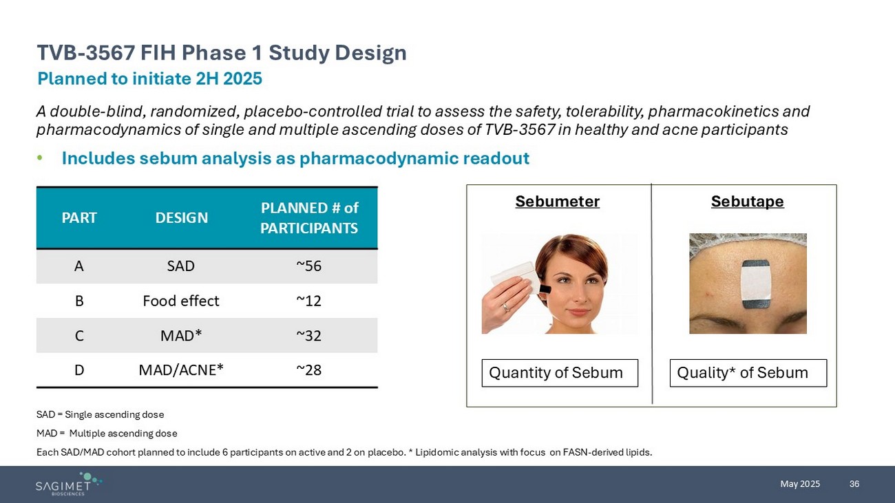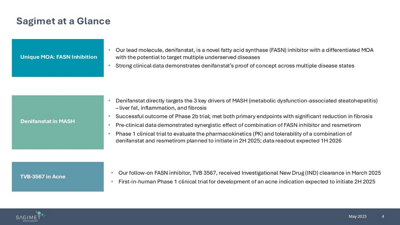 4 May 2025 Sagimet at a Glance • Our lead molecule, denifanstat, is a novel fatty acid synthase (FASN) inhibitor with a differentiated MOA with the potential to target multiple underserved diseases • Strong clinical data demonstrates denifanstat’s proof of concept across multiple disease states Unique MOA: FASN Inhibition • Denifanstat directly targets the 3 key drivers of MASH (metabolic dysfunction - associated steatohepatitis) – liver fat, inflammation, and fibrosis • Successful outcome of Phase 2b trial; met both primary endp oints with significant reduction in fibrosis • Pre - clinical data demonstrated synergistic effect of combination of FASN inhibitor and resmetirom • Phase 1 clinical trial to evaluate the pharmacokinetics ථ (PK) and tolerability of a co mbination of denifanstat and resmetirom planned to initiate in 2H 2025; data readout expected 1H 2026 Denifanstat in MASH TVB - 3567 in Acne • Our follow - on FASN inhibitor, TVB 3567, received Investigational New Drug (IND) clearance in March 2025 • First - in - human Phase 1 clinical trial for development of an acne indication expected to initiate 2H 2025