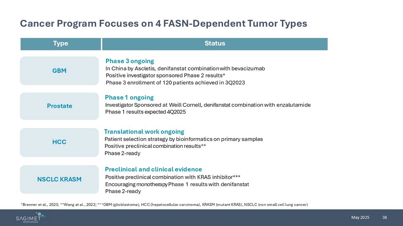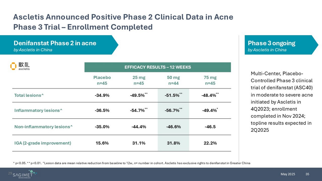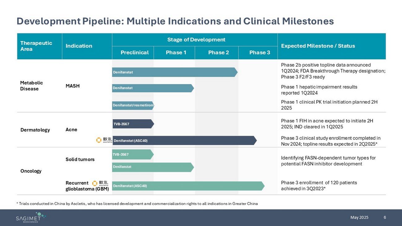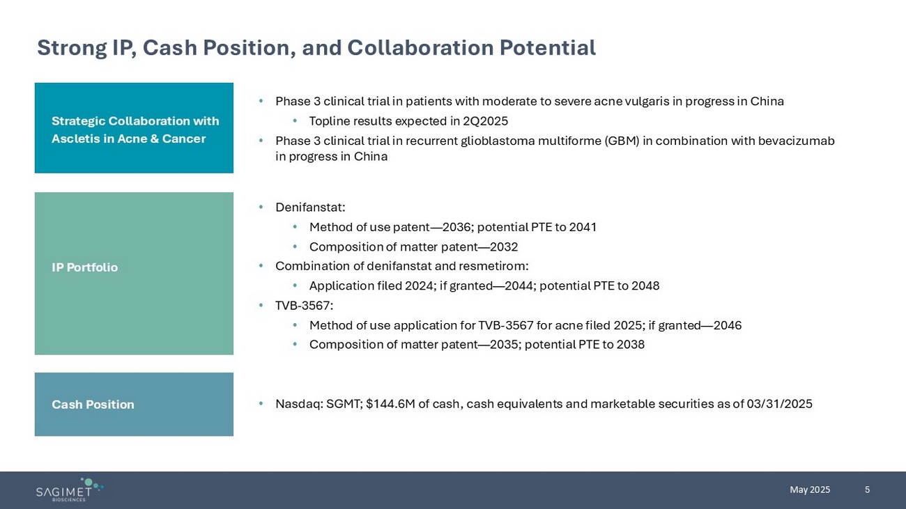 5 May 2025 Strong IP, Cash Position, and Collaboration Potential • Phase 3 clinical trial in patients with moderate to severe acne vulgaris in progress in China • Topline results expected in 2Q2025 • Phase 3 clinical trial in recurrent glioblastoma multiforme (GBM) in combination with bevacizumab in progress in China • Denifanstat: • Method of use patent — 2036; potential PTE to 2041 • Composition of matter patent — 2032 • Combination of denifanstat and resmetirom: • Application filed 2024; if granted — 2044; potential PTE to 2048 • TVB - 3567: • Method of use application for TVB - 3567 for acne filed 2025; if granted — 2046 • Composition of matter patent — 2035; potential PTE to 2038 Cash Position • Nasdaq: SGMT; $144.6M of cash, cash equivalents and marketable securities as of 03/31/2025 Strategic Collaboration with Ascletis in Acne & Cancer IP Portfolio