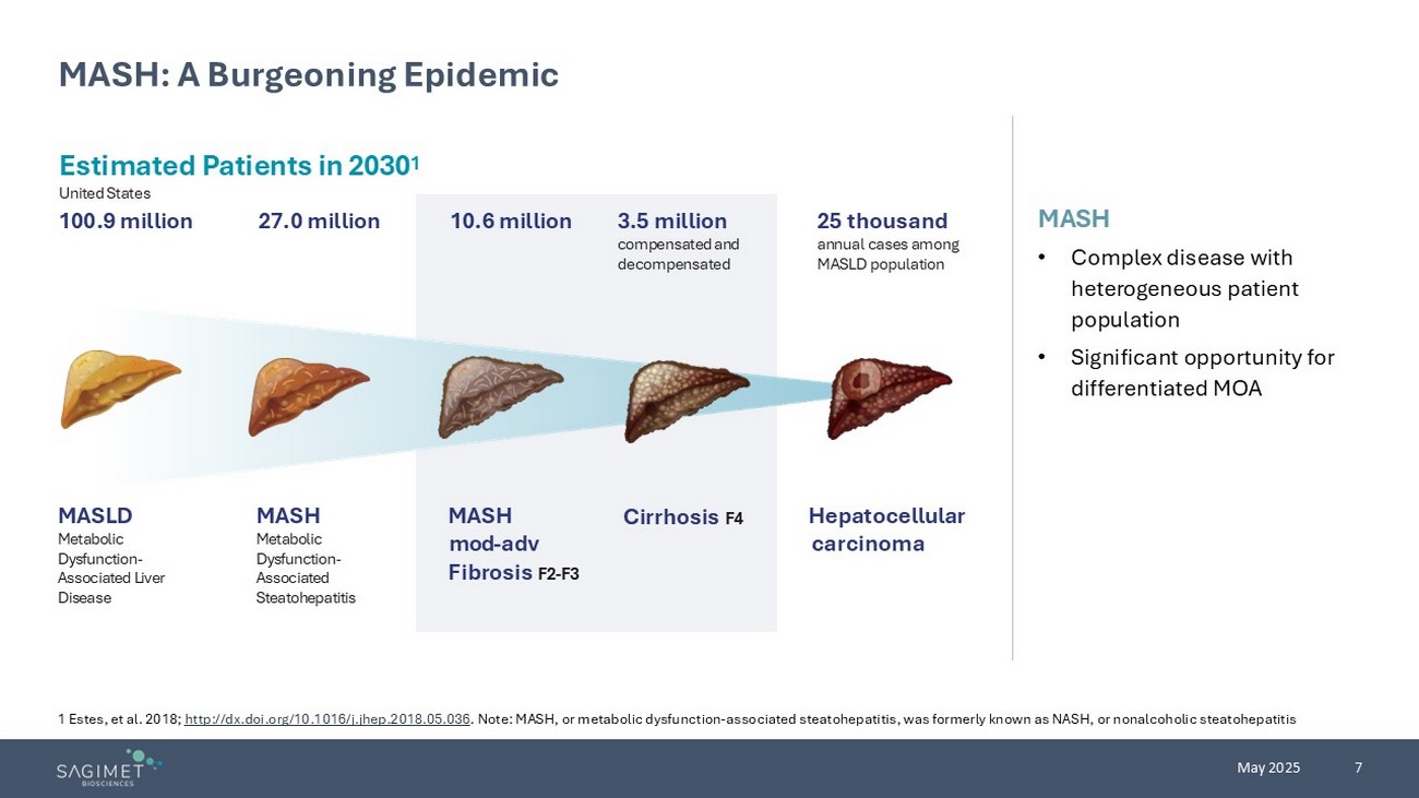7 May 2025 MASH: A Burgeoning Epidemic 1 Estes, et al. 2018; http://dx.doi.org/10.1016/j.jhep.2018.05.036 . Note: MASH, or metabolic dysfunction - associated steatohepatitis, was formerly known as NASH, or nonalcoholic steatohepatitis Disease challenges Estimated Patients in 20 30 1 United States 100.9 million Hepatocellular carcinoma Cirrhosis F4 25 thousand annual cases among MASLD population 3.5 million compensated and decompensated 27.0 million 10.6 million MASH • Complex disease with h eterogeneous patient population • Significant opportunity for differentiated MOA MASLD Metabolic Dysfunction - Associated Liver Disease MASH Metabolic Dysfunction - Associated Steatohepatitis MASH mod - adv F ibrosis F2 - F3