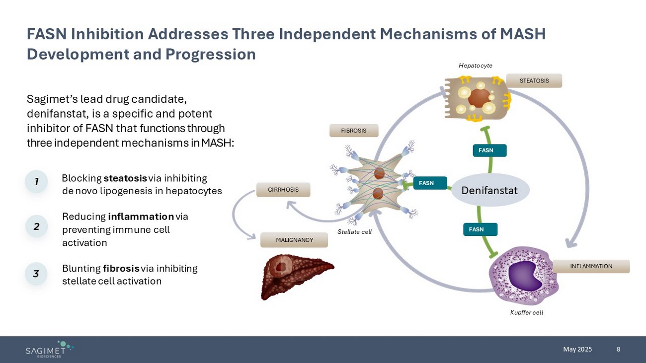8 May 2025 Sagimet’s lead drug candidate, denifanstat, is a specific and potent inhibitor of FASN that functions through three independent mechanisms in MASH : FASN Inhibition Addresses Three Independent Mechanisms of MASH Development and Progression Blocking steatosis via inhibiting de novo lipogenesis in hepatocytes Reducing inflammation via preventing immune cell activation Blunting fibrosis via inhibiting stellate cell activation 1 2 3 INFLAMMATION FIBROSIS STEATOSIS Hepatocyte Kupffer cell Stellate cell CIRRHOSIS MALIGNANCY FASN FASN FASN Denifanstat
