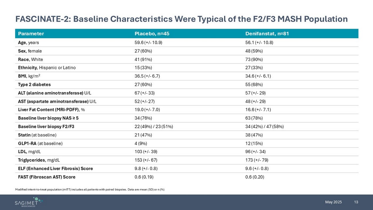 13 May 2025 FASCINATE - 2: Baseline Characteristics Were Typical of the F2/F3 MASH Population Denifanstat , n=81 Placebo, n=45 Parameter 56.1 (+/ - 10.8) 59.6 (+/ - 10.9) Age , years 48 (59%) 27 (60%) Sex , female 73 (90%) 41 (91%) Race , White 27 (33%) 15 (33%) Ethnicity , Hispanic or Latino 34.6 (+/ - 6.1) 36.5 (+/ - 6.7) BMI , kg/m 2 55 (68%) 27 (60%) Type 2 diabetes 57 (+/ - 29) 67 (+/ - 33) ALT (alanine aminotransferase) U/L 48 (+/ - 29) 52 (+/ - 27) AST (aspartate aminotransferase) U/L 16.6 (+/ - 7.1) 19.0 (+/ - 7.0) Liver Fat Content (MRI - PDFF) , % 63 (78%) 34 (76%) Baseline liver biopsy NAS ≥ 5 34 (42%) / 47 (58%) 22 (49%) / 23 (51%) Baseline liver biopsy F2/F3 38 (47%) 21 (47%) Statin (at baseline) 12 (15%) 4 (9%) GLP1 - RA (at baseline) 96 ( +/ - 34) 103 ( +/ - 39) LDL , mg/dL 173 ( +/ - 79) 153 ( +/ - 67) Triglycerides , mg/dL 9.6 ( +/ - 0.8) 9.8 ( +/ - 0.8) ELF (Enhanced Liver Fibrosis) Score 0.6 (0.20) 0.6 (0.19) FAST ( Fibroscan AST) Score Modified intent - to - treat population (mITT) includes all patients with paired biopsies. Data are mean (SD) or n (%)