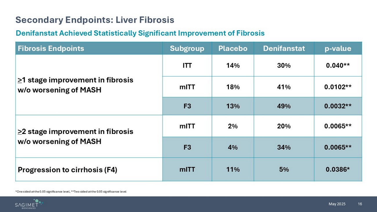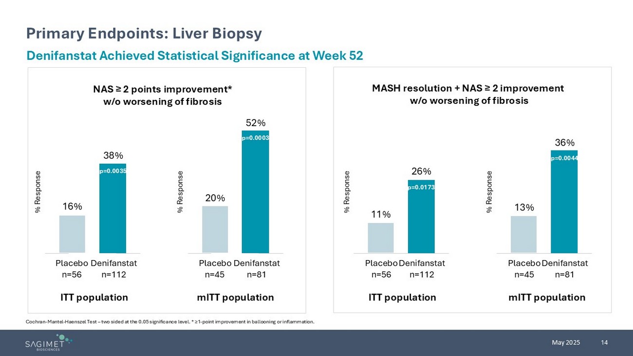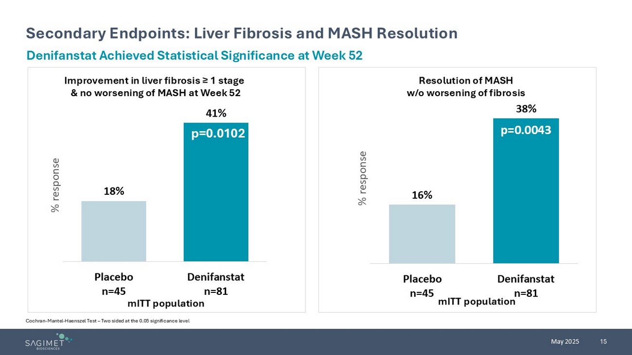14 May 2025 Primary Endpoints: Liver Biopsy Cochran - Mantel - Haenszel Test – two sided at the 0.05 significance level. * ≥1 - point improvement in ballooning or inflammation. Denifanstat Achieved Statistical Significance at Week 52 NAS ≥ 2 points improvement* w/o worsening of fibrosis p=0.0001 MASH resolution + NAS ≥ 2 improvement w/o worsening of fibrosis ITT population mITT population Placebo n=56 Denifanstat n=112 16% 38% Placebo n=56 Denifanstat n=112 11% 26% Placebo n=45 Denifanstat n=81 20% 52% Placebo n=45 Denifanstat n=81 13% 36% ITT population mITT population % Response % Response % Response % Response p=0.0173 p=0.0044 p=0.0003 p=0.0035