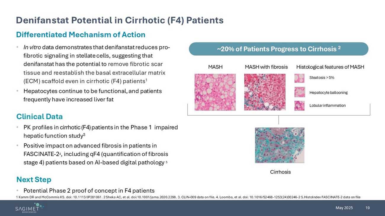 19 May 2025 1 Kamm DR and McCommis KS. doi : 10.1113/JP281061. 2 Sheka AC, et al. doi:10.1001/jama.2020.2298. 3. CLIN - 009 data on file. 4. Loomba, et al. doi : 10.1016/S2468 - 1253(24)00246 - 2 5.HistoIndex FASCINATE - 2 data on file Differentiated Mechanism of Action • In vitro data demonstrates that denifanstat reduces pro - fibrotic signaling in stellate cells , suggesting that denifanstat has the potential to remove fibrotic scar tissue and reestablish the basal extracellular matrix ( ECM ) scaffold even in cirrhotic (F4) patients 1 • Hepatocytes continue to be functional, and patients frequently have increased liver fat Clinical Data • PK profiles in cirrhotic (F4) patients in the Phase 1 impaired hepatic function study 3 • Positive impact on advanced fibrosis in patients in FASCINATE - 2 4 , including qF4 (quantification of fibrosis stage 4) patients based on AI - based digital pathology 5 Next Step • Potential Phase 2 proof of concept in F4 patients Denifanstat Potential in Cirrhotic (F4) Patients ~20% of Patients Progress to Cirrhosis 2 MASH MASH with fibrosis Histological features of MASH Steatosis > 5% Hepatocyte ballooning Lobular inflammation Cirrhosis