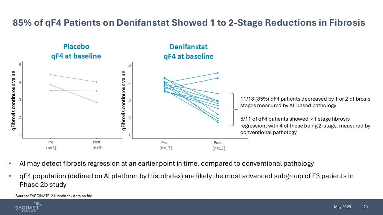 20 May 2025 Source: FASCINATE - 2 HistoIndex data on file 85% of qF4 Patients on Denifanstat Showed 1 to 2 - Stage Reductions in Fibrosis • AI may detect fibrosis regression at an earlier point in time, compared to conventional pathology • qF4 population (defined on AI platform by HistoIndex ) are likely the most advanced subgroup of F3 patients in Phase 2b study (n=3) (n=3) (n=13) (n=13) Placebo qF4 at baseline Denifanstat qF4 at baseline qFibrosis continuous value qFibrosis continuous value 11/13 (85%) qF4 patients decreased by 1 or 2 qfibrosis stages measured by AI - based pathology 5/11 of qF4 patients showed > 1 stage fibrosis regression, with 4 of these being 2 - stage, measured by conventional pathology
