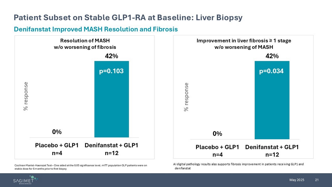 21 May 2025 Patient Subset on Stable GLP1 - RA at Baseline: Liver Biopsy Cochran - Mantel - Haenszel Test – One sided at the 0.05 significance level. mITT population GLP patients were on stable dose for 6 months prior to first biopsy Denifanstat Improved MASH Resolution and Fibrosis Resolution of MASH w/o worsening of fibrosis Improvement in liver fibrosis ≥ 1 stage w/o worsening of MASH 0% 42% Placebo + GLP1 n=4 Denifanstat + GLP1 n=12 % response 0% 42% Placebo + GLP1 n=4 Denifanstat + GLP1 n=12 % response p=0.034 p=0.103 AI digital pathology results also supports fibrosis improvement in patients receiving GLP1 and denifanstat