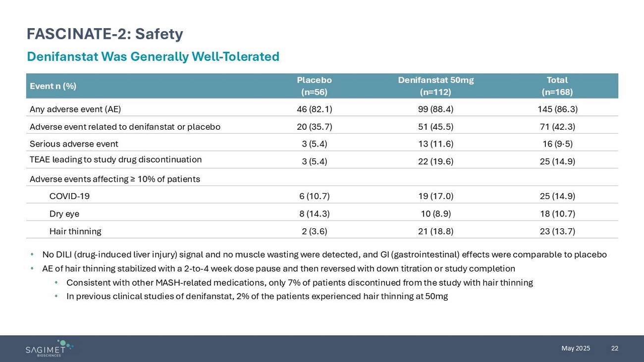22 May 2025 FASCINATE - 2: Safety Denifanstat Was Generally Well - Tolerated • No DILI (drug - induced liver injury) signal and no muscle wasting were detected, and GI (gastrointestinal) effects were comparabl e to placebo • AE of hair thinning stabilized with a 2 - to - 4 week dose pause and then reversed with down titration or study completion • Consistent with other MASH - related medications, only 7% of patients discontinued from the study with hair thinning • In previous clinical studies of denifanstat, 2% of the patients experienced hair thinning at 50mg Total (n=168) Denifanstat 50mg (n=112) Placebo (n=56) Event n (%) 145 (86.3) 99 (88.4) 46 (82.1) Any adverse event (AE) 71 (42.3) 51 (45.5) 20 (35.7) Adverse event related to denifanstat or placebo 16 (9·5) 13 (11.6) 3 (5.4) Serious adverse event 25 (14.9) 22 (19.6) 3 (5.4) TEAE leading to study drug discontinuation Adverse events affecting ≥ 10% of patients 25 (14.9) 19 (17.0) 6 (10.7) COVID - 19 18 (10.7) 10 (8.9) 8 (14.3) Dry eye 23 (13.7) 21 (18.8) 2 (3.6) Hair thinning