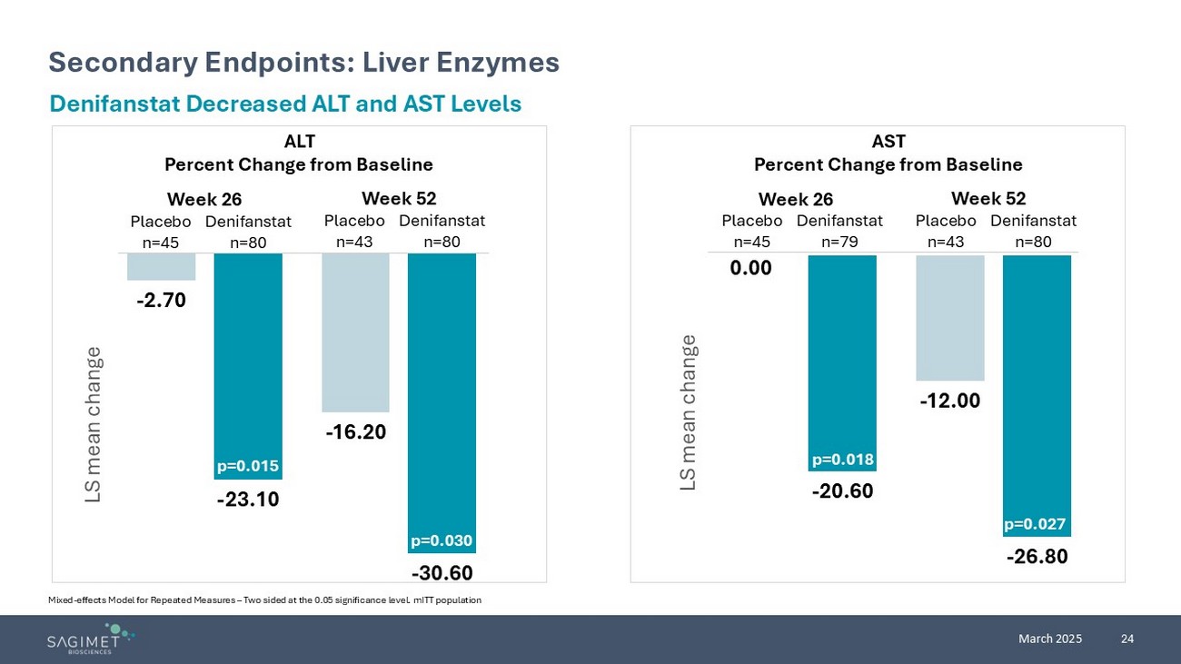 24 March 2025 Secondary Endpoints: Liver Enzymes Mixed - effects Model for Repeated Measures – Two sided at the 0.05 significance level. mITT population Denifanstat Decreased ALT and AST Levels ALT Percent Change from Baseline AST Percent Change from Baseline - 2.70 - 16.20 - 23.10 - 30.60 LS mean change p=0.015 p=0.030 0.00 - 12.00 - 20.60 - 26.80 LS mean change p=0.018 p=0.027 Week 26 Week 52 Week 26 Week 52 Placebo n=45 Denifanstat n=80 Placebo n=43 Denifanstat n=80 Placebo n=45 Denifanstat n=79 Placebo n=43 Denifanstat n=80