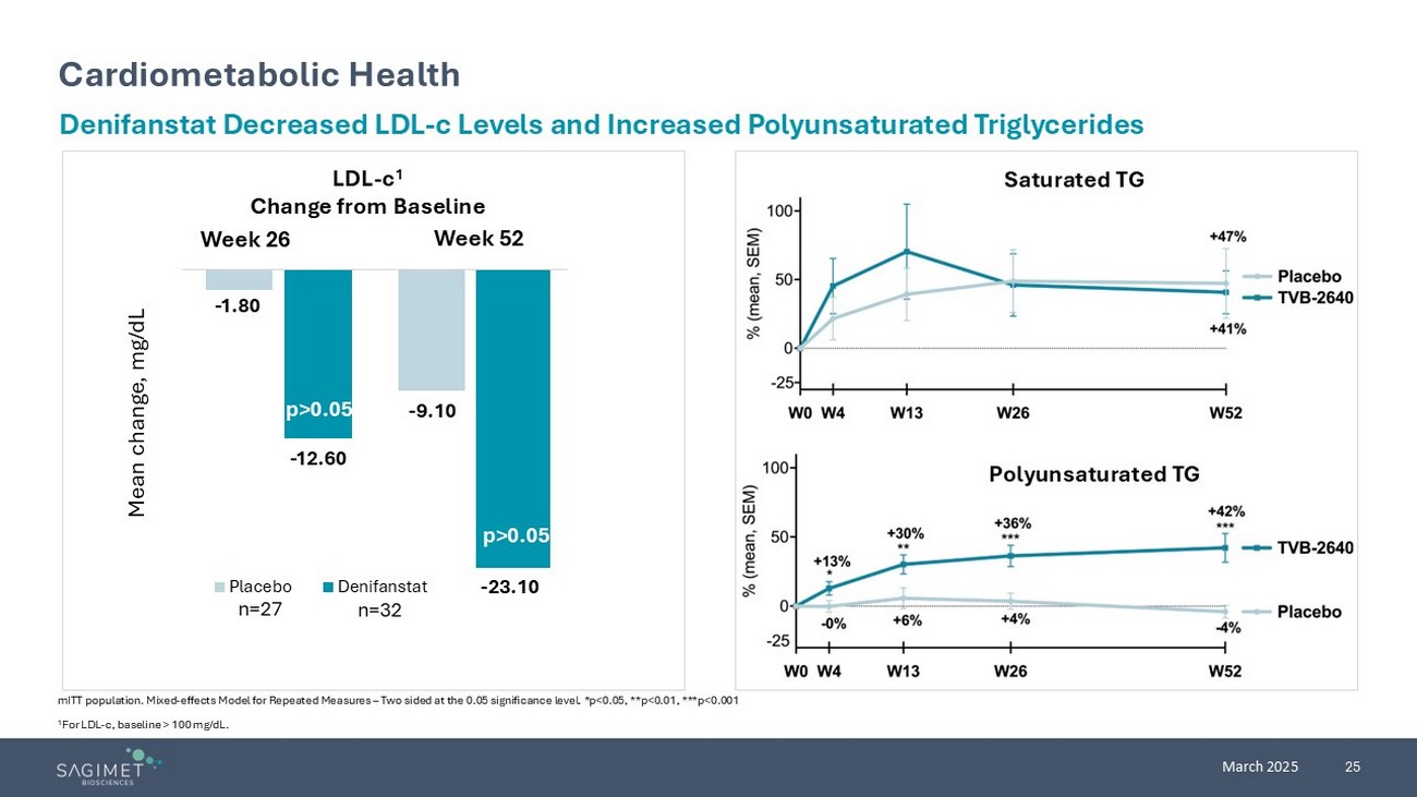 25 March 2025 Cardiometabolic Health mITT population. Mixed - effects Model for Repeated Measures – Two sided at the 0.05 significance level. *p<0.05, **p<0.01, ***p<0.001 1 For LDL - c, baseline > 100 mg/dL. Denifanstat Decreased LDL - c Levels and Increased Polyunsaturated Triglycerides LDL - c 1 Change from Baseline Saturated TG Polyunsaturated TG Week 26 Week 52 p>0.05 Mean change, mg/dL n=27 n=32 - 1.80 - 9.10 - 12.60 - 23.10 Placebo Denifanstat p>0.05 - 1.80 n=27 n=32 p>0.05