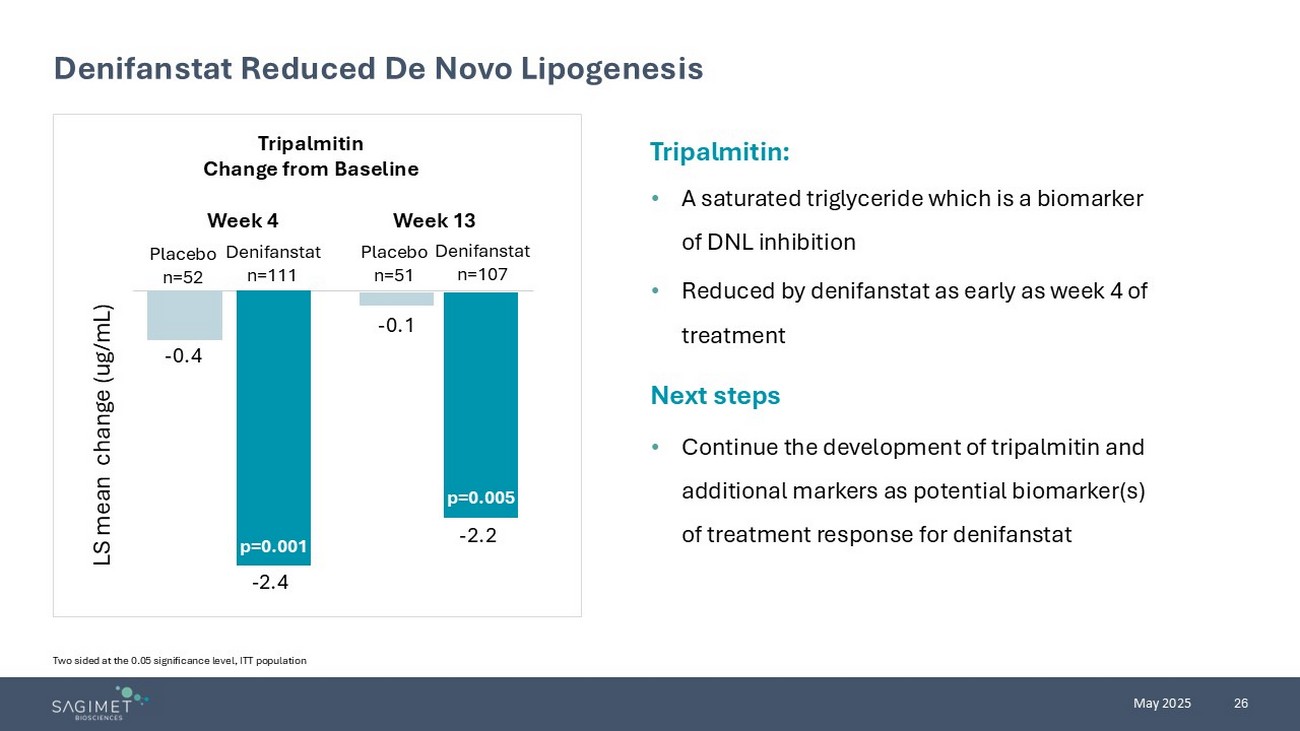 26 May 2025 Denifanstat Reduced De Novo Lipogenesis Two sided at the 0.05 significance level , ITT population Tripalmitin : • A saturated triglyceride which is a biomarker of DNL inhibition • Reduced by denifanstat as early as week 4 of treatment Next steps • Continue the development of tripalmitin and additional markers as potential biomarker(s) of treatment response for denifanstat Tripalmitin Change from Baseline Placebo n=52 Denifanstat n=111 Placebo n=51 Denifanstat n=107 - 2.2 LS mean change (ug/mL) - 2.4 - 0.4 - 0.1 P=0.005 Week 4 Week 13 p=0.001 p=0.005
