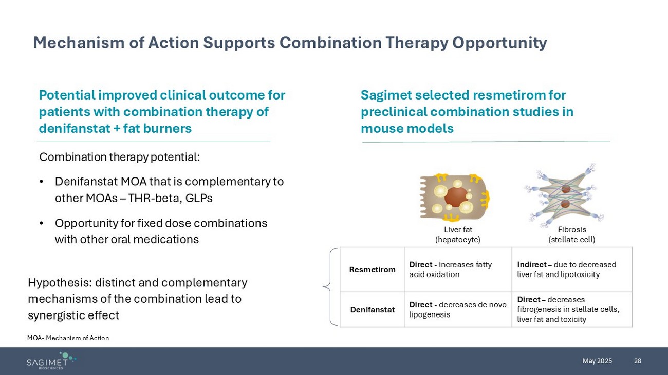 28 May 2025 Mechanism of Action Supports Combination Therapy Opportunity MOA - Mechanism of Action Combination therapy potential: • Denifanstat MOA that is complementary to other MOAs – THR - beta, GLPs • Opportunity for fixed dose combinations with other oral medications Potential improved clinical outcome for patients with combination therapy of denifanstat + fat burners Hypothesis: distinct and complementary mechanisms of the combination lead to synergistic effect Sagimet selected resmetirom for preclinical combination studies in mouse models Fibrosis (stellate cell) Liver fat (hepatocyte) Indirect – due to decreased liver fat and lipotoxicity Direct - increases fatty acid oxidation Resmetirom Direct – decreases fibrogenesis in stellate cells, liver fat and toxicity Direct - decreases de novo lipogenesis Denifanstat