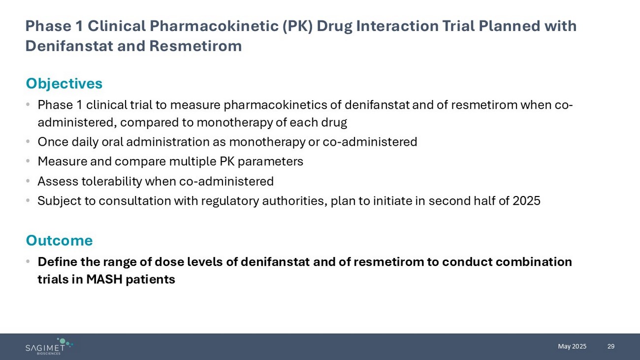 29 May 2025 Phase 1 Clinical Pharmacokinetic (PK) Drug Interaction Trial Planned with Denifanstat and Resmetirom Objectives • Phase 1 clinical trial to measure pharmacokinetics of denifanstat and of resmetirom when co - administered, compared to monotherapy of each drug • Once daily oral administration as monotherapy or co - administered • Measure and compare multiple PK parameters • Assess tolerability when co - administered • Subject to consultation with regulatory authorities, plan to initiate in second half of 2025 Outcome • Define the range of dose levels of denifanstat and of resmetirom to conduct combination trials in MASH patients