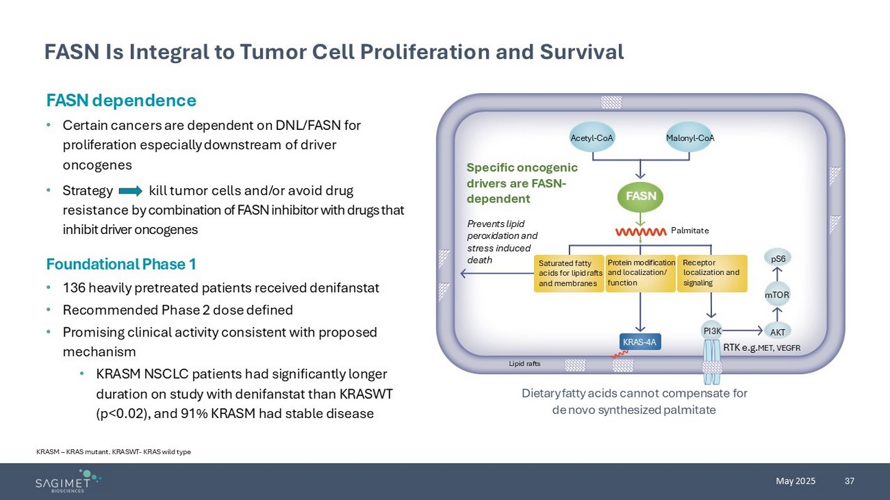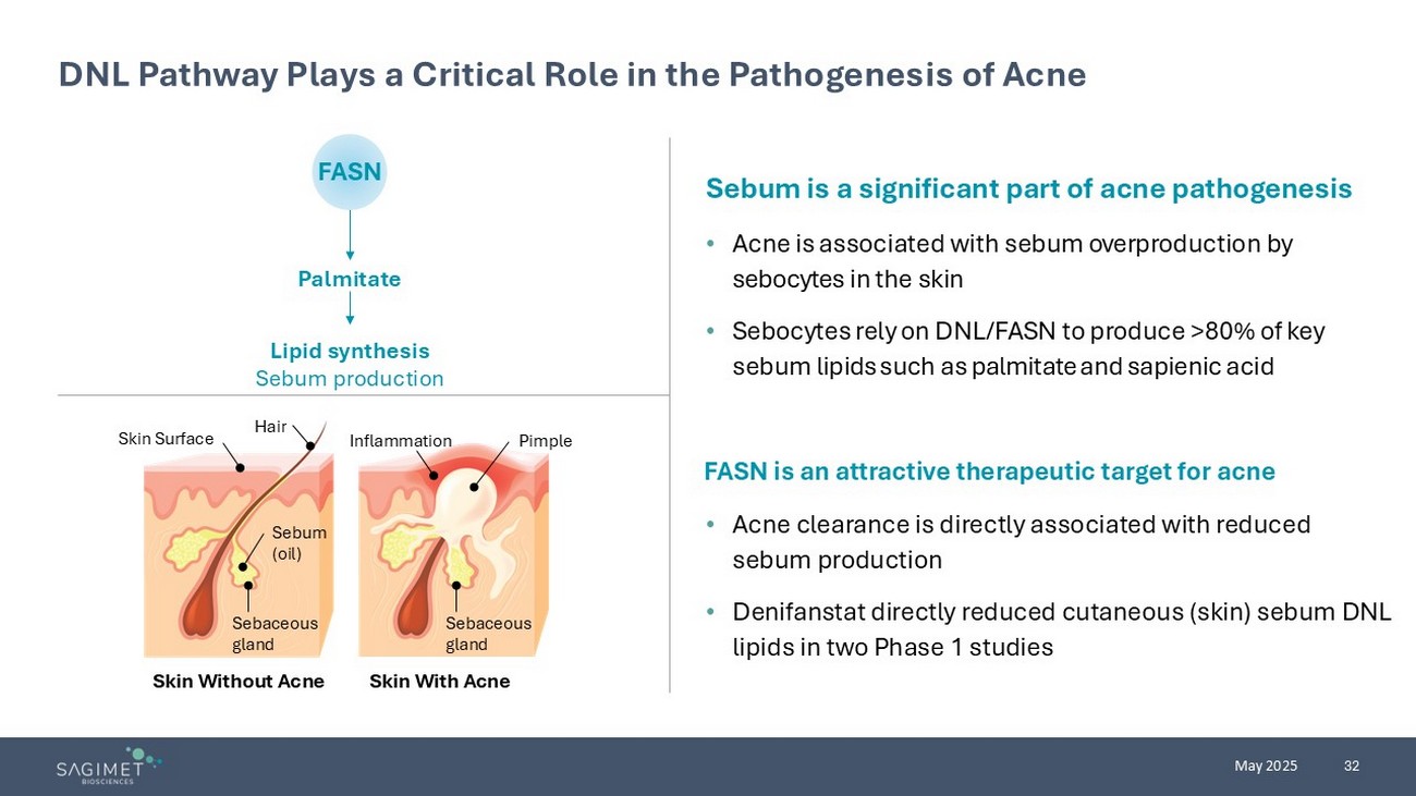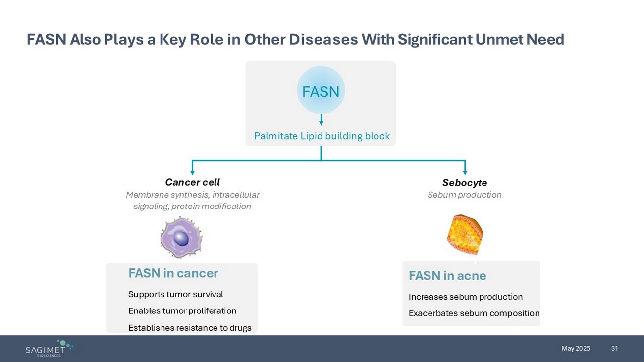 31 May 2025 FASN Also Plays a Key Role in Other Diseases With Significant Unmet Need FASN in cancer Supports t umor survival Enables t umor proliferation Establishes r esistance to drugs FASN in acne Increases sebum production Exacerbates sebum composition Cancer cell Membrane synthesis, intracellular signaling, protein modification Sebocyte Sebum production Palmitate Lipid building block FASN
