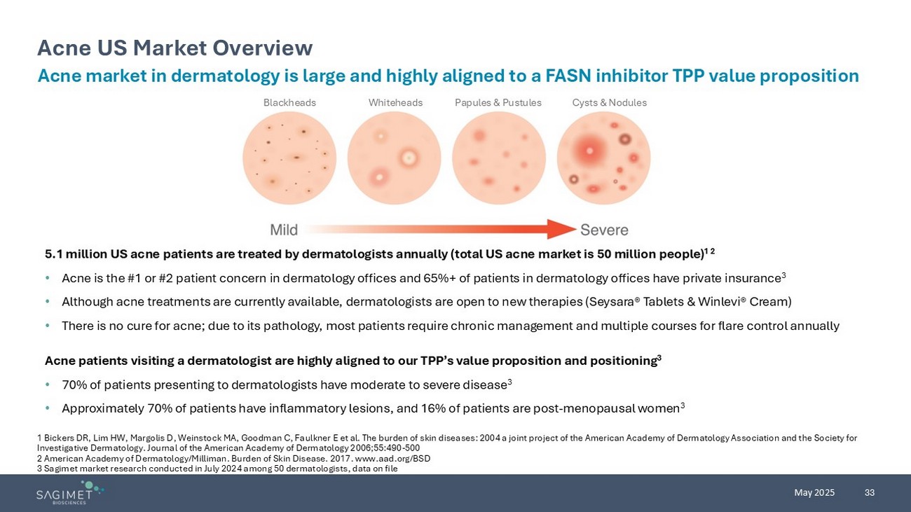 33 May 2025 Blackheads Whiteheads Papules & Pustules Cysts & Nodules Acne US Market Overview Acne market in dermatology is large and highly aligned to a FASN inhibitor TPP value proposition 5.1 million US acne patients are treated by dermatologists annually (total US acne market is 50 million people ) 1 2 • Acne is the #1 or #2 patient concern in dermatology offices and 65%+ of patients in dermatology offices have private insurance 3 • Although acne treatments are currently available, d ermatologists are open to new therapies ( Seysara ® Tablets & Winlevi ® Cream) • T here is no cure for acne ; due to its pathology, most patients require chronic management and multiple courses for flare control annually Acne patients visiting a dermatologist are highly aligned to our TPP’s value proposition and positioning 3 • 70 % of patients presenting to dermatologists have moderate to severe disease 3 • Approximately 70% of patients have inflammatory lesions, and 16% of patients are post - menopausal women 3 1 Bickers DR, Lim HW, Margolis D, Weinstock MA, Goodman C, Faulkner E et al. The burden of skin diseases: 2004 a joint projec t o f the American Academy of Dermatology Association and the Society for Investigative Dermatology. Journal of the American Academy of Dermatology 2006;55:490 - 500 2 American Academy of Dermatology/Milliman. Burden of Skin Disease. 2017. www.aad.org/BSD 3 Sagimet market research conducted in July 2024 among 50 dermatologists, data on file