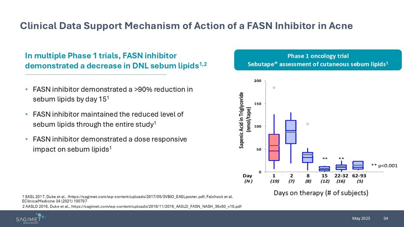 34 May 2025 Clinical Data Support Mechanism of Action of a FASN Inhibitor in Acne • FASN inhibitor demonstrated a >90% reduction in sebum lipids by day 15 1 • FASN inhibitor maintained the reduced level of sebum lipids through the entire study 1 • FASN inhibitor demonstrated a dose responsive impact on sebum lipids 1 I n multiple Phase 1 trials, FASN inhibitor demonstrated a decrease in DNL sebum lipids 1,2 1 EASL 2017, Duke et al. /https://sagimet.com/wp - content/uploads/2017/05/3VBIO_EASLposter.pdf, Falchook et al. EClinicalMedicine 34 (2021) 100797 Days on therapy (# of subjects) 2 AASLD 2016, Duke et al., https://sagimet.com/wp - content/uploads/2016/11/2016_AASLD_FASN_NASH_36x60_v10.pdf Phase 1 oncology trial Sebutape ® assessment of cutaneous sebum lipids 1