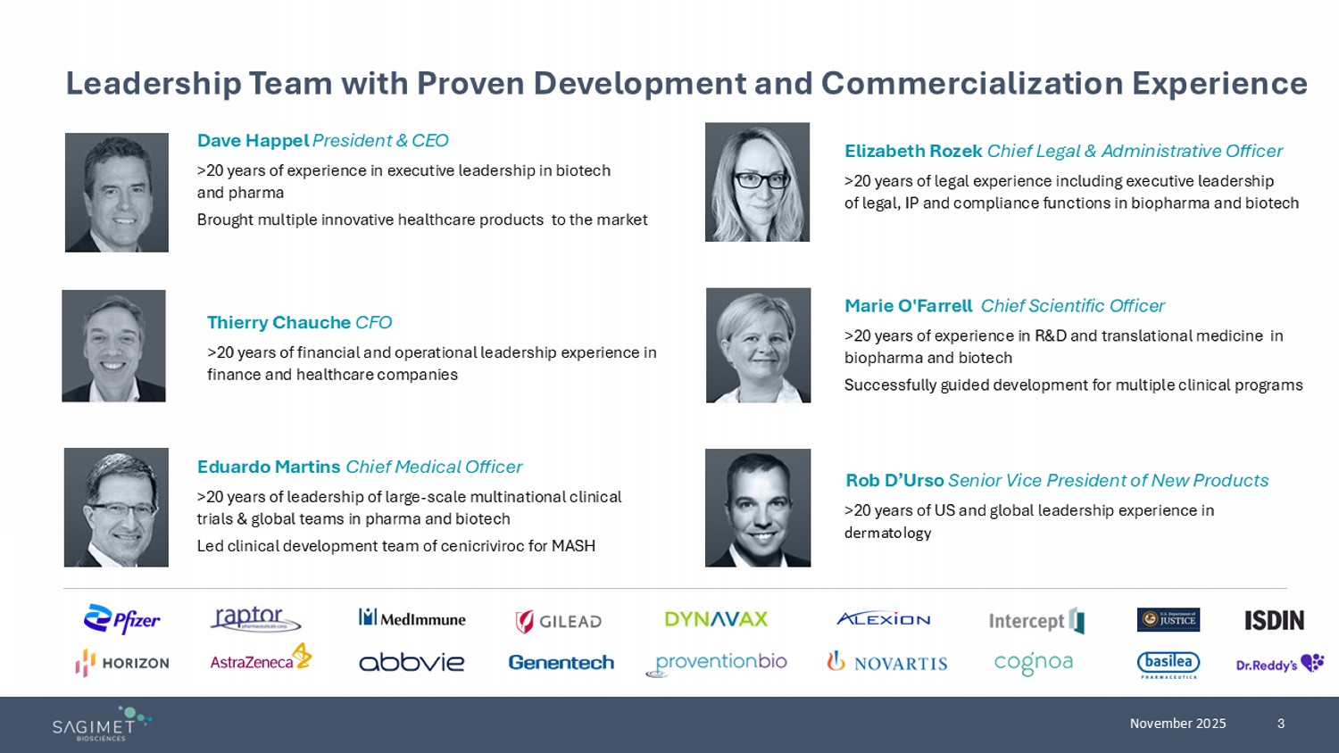 2 November 2025 Forward - Looking Statements and Disclaimer This presentation contains forward - looking statements within the meaning of, and made pursuant to the safe harbor provisions of, The Private Securities Litigation Reform Act of 1995 . All statements contained in this document, other than statements of historical facts or statements that relate to present facts or current conditions, including but not limited to, statements regarding possible or assumed future results of operations, business strategies, research and development plans, regulatory activities, the presentation of data from clinical trials, Sagimet’s clinical development plans and related anticipated clinical development milestones, market opportunity, competitive position and potential growth opportunities are forward - looking statements . These statements involve known and unknown risks, uncertainties and other important factors that may cause our actual results, performance or achievements to be materially different from any future results, performance or achievements expressed or implied by the forward - looking statements . In some cases, you can identify forward - looking statements by terms such as “may,” “will,” “should,” “would,” “expect,” “plan,” “anticipate,” “could,” “intend,” “target,” “project,” “believe,” “estimate,” “predict,” “potential,” or “continue” or the negative of these terms or other similar expressions . The forward - looking statements in this presentation are only predictions . These forward - looking statements speak only as of the date of this presentation and are subject to a number of risks, uncertainties and assumptions, some of which cannot be predicted or quantified and some of which are beyond our control, including, among others : the clinical development and therapeutic potential of denifanstat , TVB - 3567 or any other drug candidates or combination therapies developed by Sagimet ; our ability to advance drug candidates into and successfully complete clinical trials , the risk the topline clinical trials may not be predictive of, and may differ from final clinical data and later - stage clinical trials ; our ability to advance drug candidates into and successfully complete clinical trials within anticipated timelines ; that unfavorable new clinical trial data may emerge in other clinical trials of our product candidates ; that clinical trial data are subject to differing interpretations and assessments, including by regulatory authorities ; our relationship with Ascletis , and the success of its development efforts for denifanstat ; the accuracy of our estimates regarding our capital requirements ; and our ability to maintain and successfully enforce adequate intellectual property protection . These and other risks and uncertainties are described more fully in the “Risk Factors” section of our most recent filings with the Securities and Exchange Commission (SEC) and available at www . sec . gov . You should not rely on these forward - looking statements as predictions of future events . The events and circumstances reflected in our forward - looking statements may not be achieved or occur, and actual results could differ materially from those projected in the forward - looking statements . Moreover, we operate in a dynamic industry and economy . New risk factors and uncertainties may emerge from time to time, and it is not possible for management to predict all risk factors and uncertainties that we may face . Except as required by applicable law, we do not plan to publicly update or revise any forward - looking statements contained herein, whether as a result of any new information, future events, changed circumstances or otherwise .