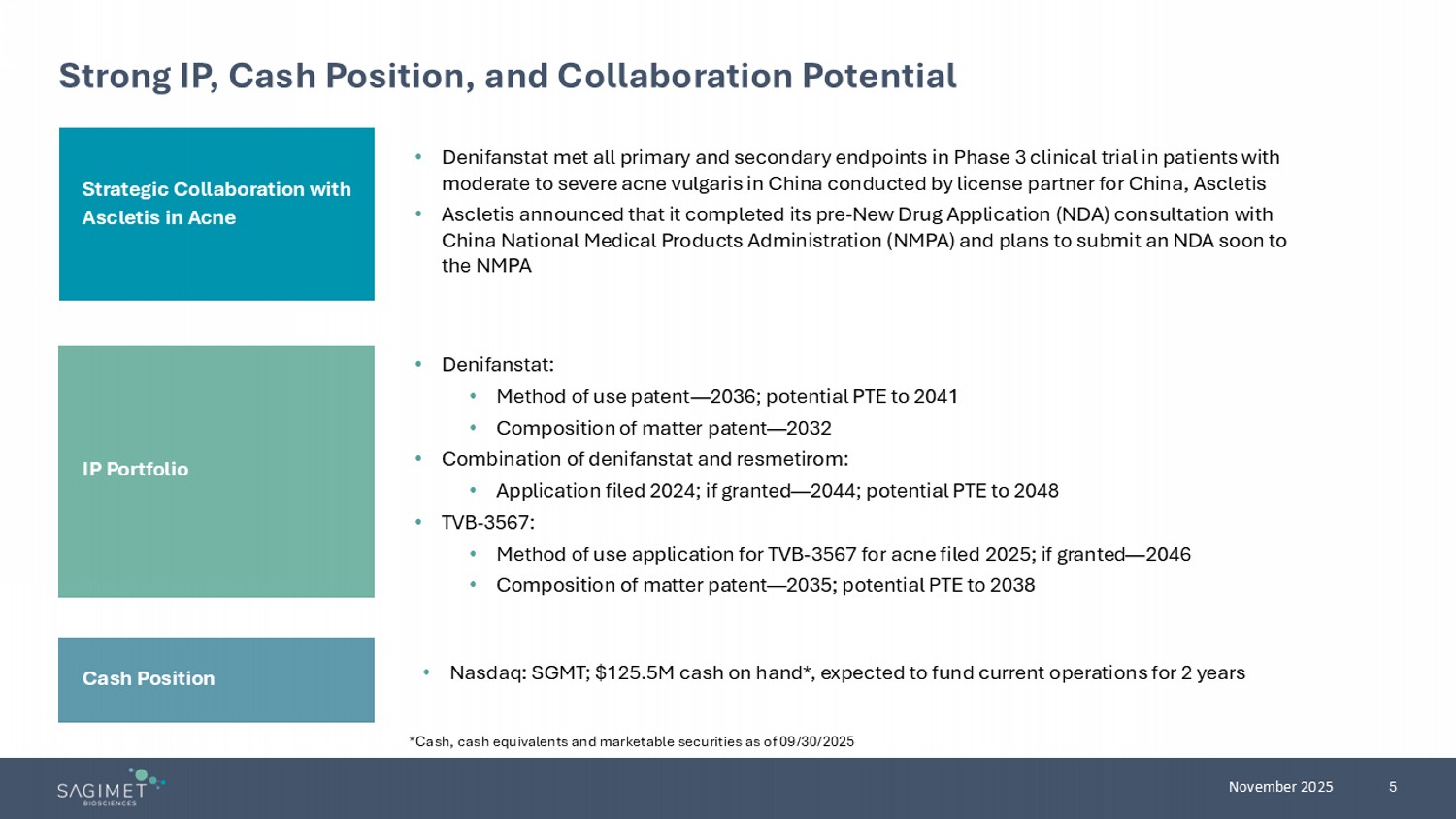 5 November 2025 Strong IP, Cash Position, and Collaboration Potential • Denifanstat met all primary and secondary endpoints in Phase 3 clinical trial in patients with moderate to severe acne vulgaris in China conducted by license partner for China, Ascletis • Ascletis announced that it completed its pre - New Drug Application (NDA) consultation with China National Medical Products Administration (NMPA) and plans to submit an NDA soon to the NMPA • Denifanstat: • Method of use patent — 2036; potential PTE to 2041 • Composition of matter patent — 2032 • Combination of denifanstat and resmetirom: • Application filed 2024; if granted — 2044; potential PTE to 2048 • TVB - 3567: • Method of use application for TVB - 3567 for acne filed 2025; if granted — 2046 • Composition of matter patent — 2035; potential PTE to 2038 Cash Position • Nasdaq: SGMT; $125.5M cash on hand*, expected to fund current operations for 2 years Strategic Collaboration with Ascletis in Acne IP Portfolio *Cash, cash equivalents and marketable securities as of 09/30/2025
