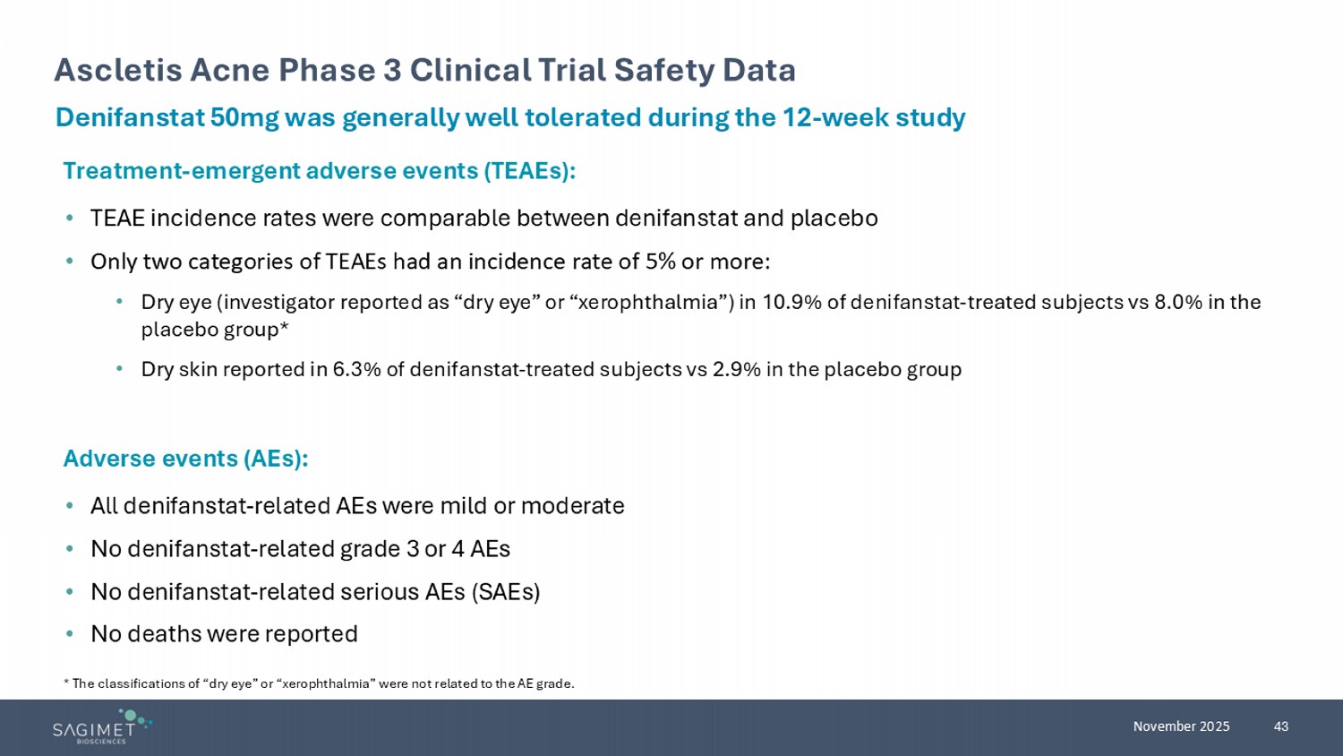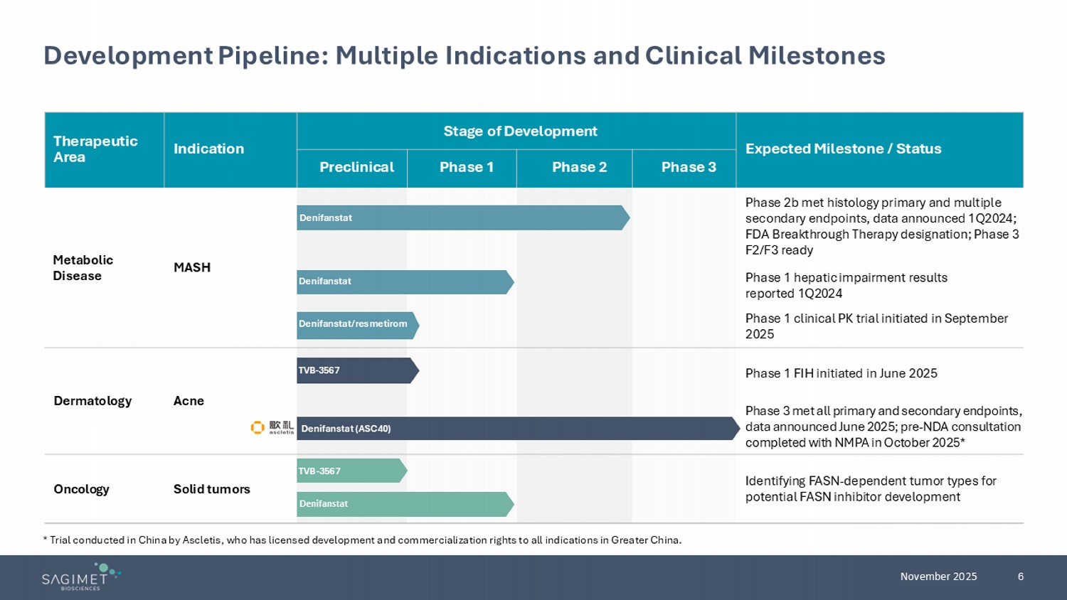 | · | In October 2025, Sagimet presented the data from Ascletis’ Phase 3 clinical trial for the treatment of moderate to severe acne vulgaris in China at the 2025 Fall Clinical Dermatology Conference (here). As reported by Ascletis, in the clinical trial of 480 patients, once daily 50 mg denifanstat met all efficacy endpoints and was generally well-tolerated. |