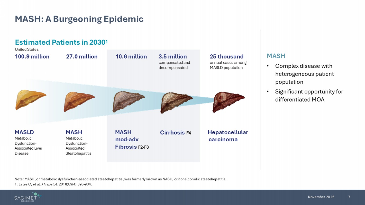 7 November 2025 MASH • Complex disease with h eterogeneous patient population • Significant opportunity for differentiated MOA MASH: A Burgeoning Epidemic Note: MASH, or metabolic dysfunction - associated steatohepatitis, was formerly known as NASH, or nonalcoholic steatohepatitis. 1. Estes C, et al. J Hepatol. 2018;69(4):896 - 904. Estimated Patients in 20 30 1 United States 100.9 million Hepatocellular carcinoma Cirrhosis F4 25 thousand annual cases among MASLD population 3.5 million compensated and decompensated 27.0 million 10.6 million MASLD Metabolic Dysfunction - Associated Liver Disease MASH Metabolic Dysfunction - Associated Steatohepatitis MASH mod - adv F ibrosis F2 - F3
