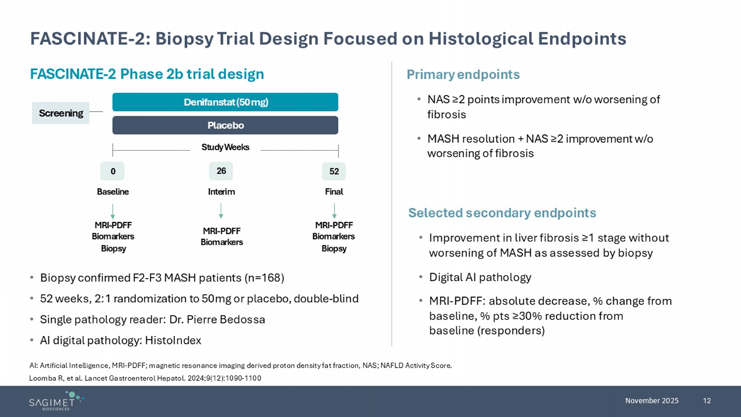 12 November 2025 FASCINATE - 2: Biopsy Trial Design Focused on Histological Endpoints AI: Artificial Intelligence, MRI - PDFF; magnetic resonance imaging derived proton density fat fraction, NAS; NAFLD Activity Score . • Biopsy confirmed F2 - F3 MASH patients (n=168) • 52 weeks, 2:1 randomization to 50mg or placebo, double - blind • Single pathology reader: Dr. Pierre Bedossa • AI digital pathology: HistoIndex Primary endpoints • NAS ≥2 points improvement w/o worsening of fibrosis • MASH resolution + NAS ≥2 improvement w/o worsening of fibrosis Selected secondary endpoints • Improvement in liver fibrosis ≥1 stage without worsening of MASH as assessed by biopsy • Digital AI pathology • MRI - PDFF: absolute decrease, % change from baseline, % pts ≥30% reduction from baseline (responders) FASCINATE - 2 Phase 2b trial design Screening Placebo Denifanstat (50 mg) 0 26 52 Study Weeks Baseline Interim Final MRI - PDFF Biomarkers Biopsy MRI - PDFF Biomarkers MRI - PDFF Biomarkers Biopsy Loomba R, et al. Lancet Gastroenterol Hepatol. 2024;9(12):1090 - 1100