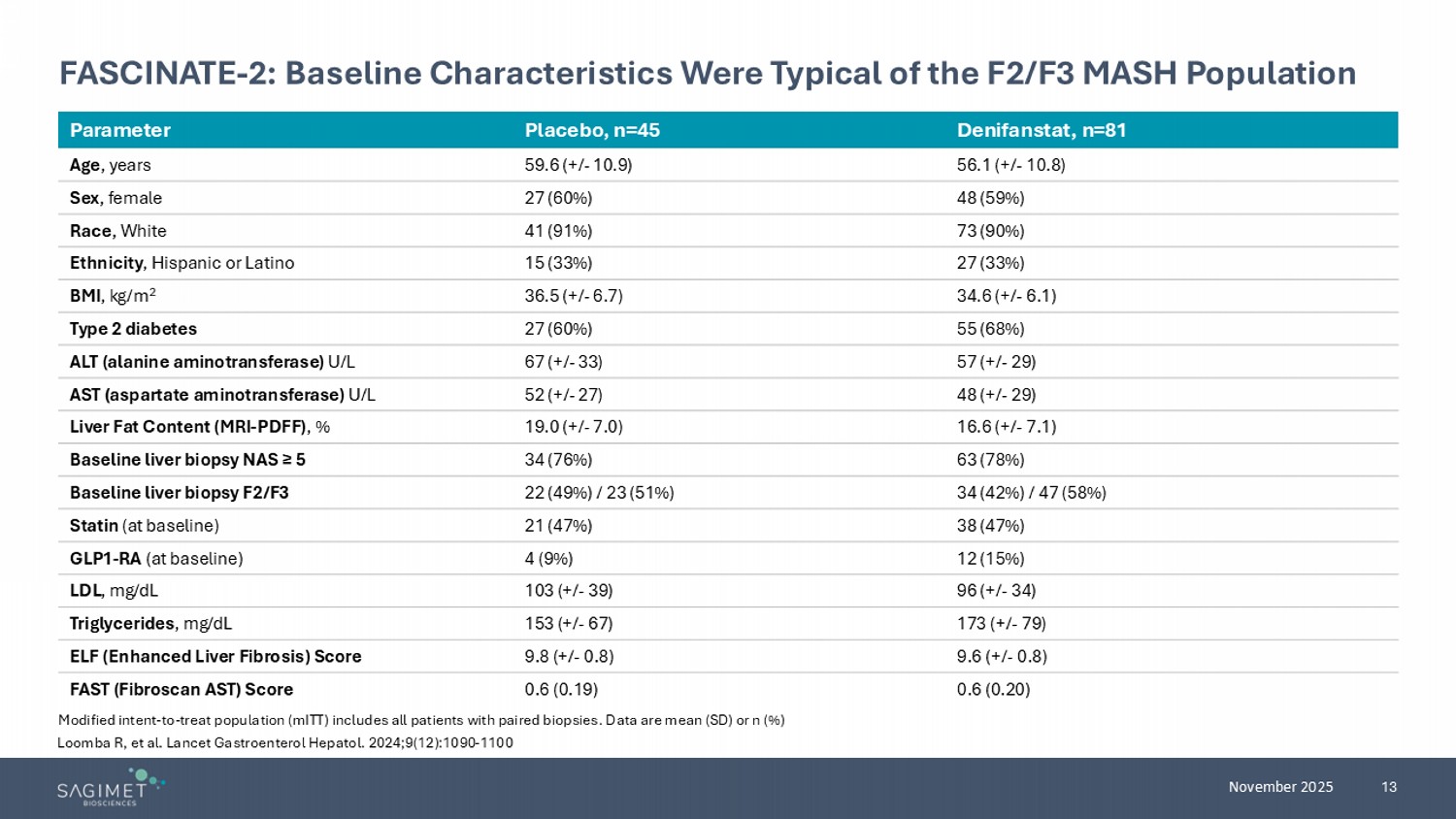 13 November 2025 FASCINATE - 2: Baseline Characteristics Were Typical of the F2/F3 MASH Population Denifanstat , n=81 Placebo, n=45 Parameter 56.1 (+/ - 10.8) 59.6 (+/ - 10.9) Age , years 48 (59%) 27 (60%) Sex , female 73 (90%) 41 (91%) Race , White 27 (33%) 15 (33%) Ethnicity , Hispanic or Latino 34.6 (+/ - 6.1) 36.5 (+/ - 6.7) BMI , kg/m 2 55 (68%) 27 (60%) Type 2 diabetes 57 (+/ - 29) 67 (+/ - 33) ALT (alanine aminotransferase) U/L 48 (+/ - 29) 52 (+/ - 27) AST (aspartate aminotransferase) U/L 16.6 (+/ - 7.1) 19.0 (+/ - 7.0) Liver Fat Content (MRI - PDFF) , % 63 (78%) 34 (76%) Baseline liver biopsy NAS ≥ 5 34 (42%) / 47 (58%) 22 (49%) / 23 (51%) Baseline liver biopsy F2/F3 38 (47%) 21 (47%) Statin (at baseline) 12 (15%) 4 (9%) GLP1 - RA (at baseline) 96 ( +/ - 34) 103 ( +/ - 39) LDL , mg/dL 173 ( +/ - 79) 153 ( +/ - 67) Triglycerides , mg/dL 9.6 ( +/ - 0.8) 9.8 ( +/ - 0.8) ELF (Enhanced Liver Fibrosis) Score 0.6 (0.20) 0.6 (0.19) FAST ( Fibroscan AST) Score Modified intent - to - treat population ( mITT ) includes all patients with paired biopsies. Data are mean (SD) or n (%) Loomba R, et al. Lancet Gastroenterol Hepatol. 2024;9(12):1090 - 1100
