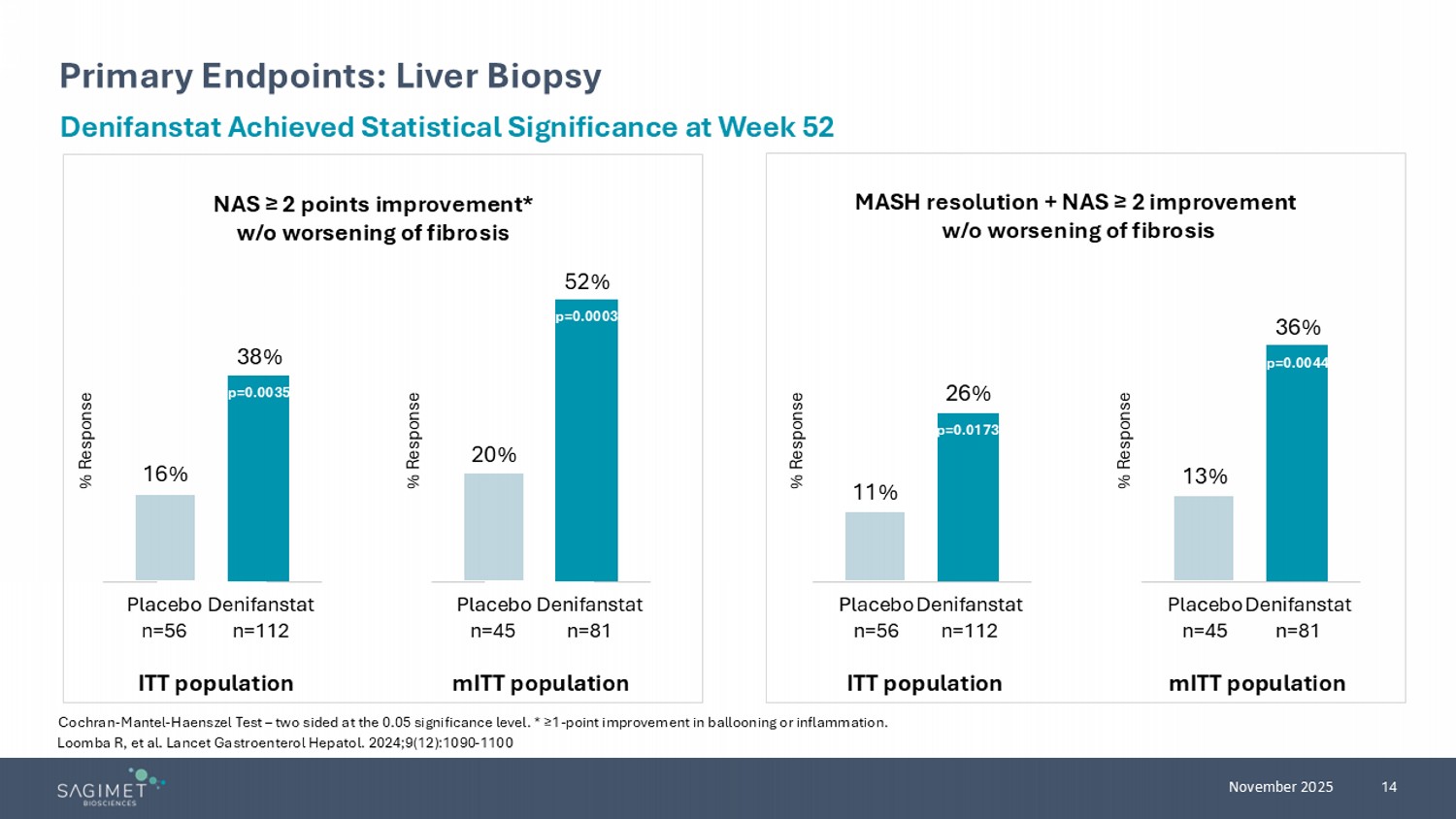 23 November 2025 Denifanstat Decreased Liver Fat by MRI - PDFF and Reduced FAST Score > 30% reduction: Cochran - Mantel - Haenszel Test. Relative reduction: Mixed - effects Model for Repeated Measures. mITT population. Two sided at the 0.05 significance level. Denifanstat Achieved Statistical Significance 21% 65% Placebo n=38 Denifanstat n=69 % response p<0.0001 MRI - PDFF ≥ 30% Relative Reduction, Week 52 FAST Change from Baseline - 0.10 - 0.10 - 0.20 - 0.30 LS mean change p<0.0001 p<0.0001 Week 26 Week 52 Placebo n=42 Denifanstat n=76 Placebo n=40 Denifanstat n=73 Mixed - effects Model for Repeated Measures – Two sided at the 0.05 significance level. mITT population. Loomba R, et al. Lancet Gastroenterol Hepatol. 2024;9(12):1090 - 1100. Sagimet Biosciences data on file.