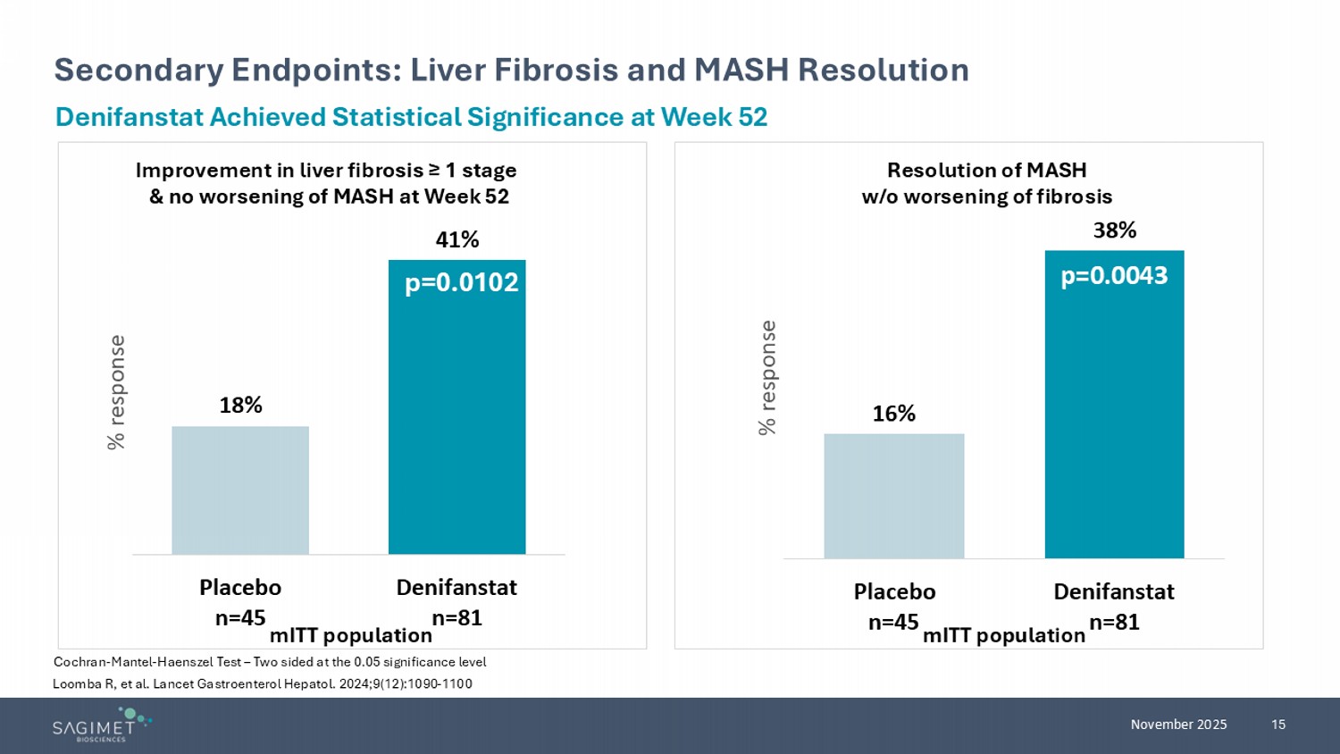 14 November 2025 Loomba R, et al. Lancet Gastroenterol Hepatol. 2024;9(12):1090 - 1100 Primary Endpoints: Liver Biopsy Cochran - Mantel - Haenszel Test – two sided at the 0.05 significance level. * ≥1 - point improvement in ballooning or inflammation. Denifanstat Achieved Statistical Significance at Week 52 NAS ≥ 2 points improvement* w/o worsening of fibrosis MASH resolution + NAS ≥ 2 improvement w/o worsening of fibrosis ITT population mITT population Placebo n=56 Denifanstat n=112 16% 38% Placebo n=56 Denifanstat n=112 11% 26% Placebo n=45 Denifanstat n=81 20% 52% Placebo n=45 Denifanstat n=81 13% 36% ITT population mITT population % Response % Response % Response % Response p=0.0173 p=0.0044 p=0.0003 p=0.0035