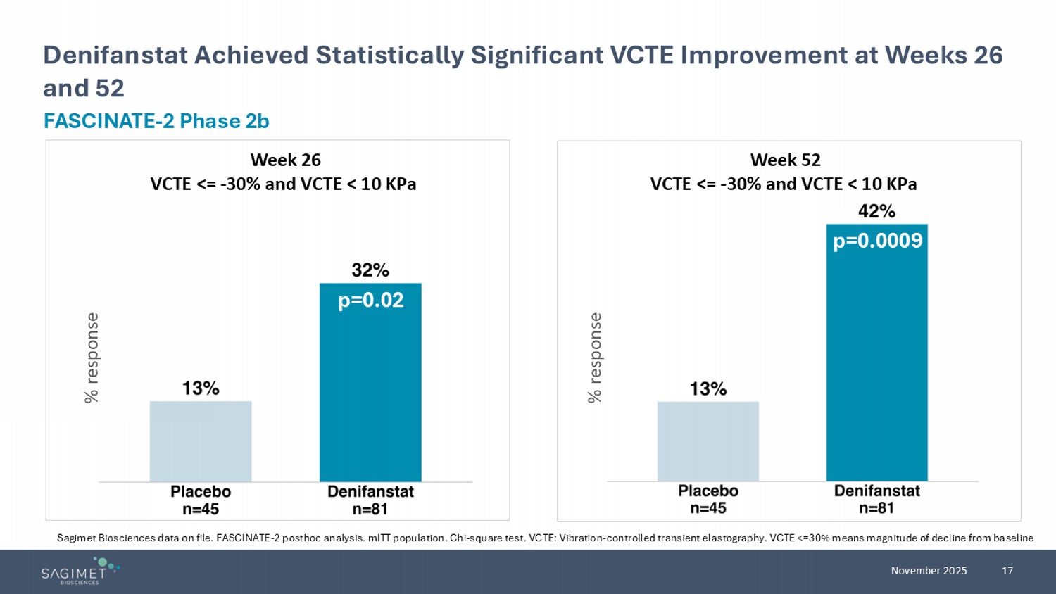 17 November 2025 Denifanstat Achieved Statistically Significant VCTE Improvement at Weeks 26 and 52 FASCINATE - 2 Phase 2b Sagimet Biosciences data on file. FASCINATE - 2 posthoc analysis. mITT population. Chi - square test. VCTE: Vibration - controlled transient elastography. VCTE <=30% means magnitude of decline from baseline p=0.0009 % response % response p=0.02 Week 26 VCTE <= - 30% and VCTE < 10 KPa Week 52 VCTE <= - 30% and VCTE < 10 KPa