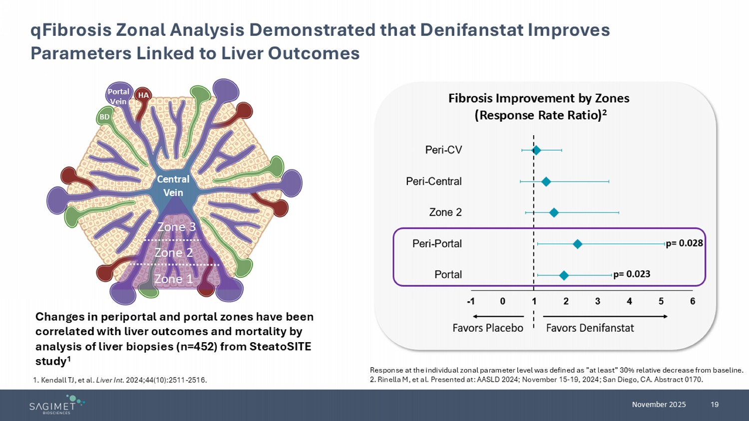19 November 2025 qFibrosis Zonal Analysis Demonstrated that Denifanstat Improves Parameters Linked to Liver Outcomes Zone 1 Zone 2 Zone 3 Central Vein Portal Vein HA BD Response at the individual zonal parameter level was defined as ”at least” 30% relative decrease from baseline. 2. Rinella M, et al. Presented at: AASLD 2024; November 15 - 19, 2024; San Diego, CA. Abstract 0170. Fibrosis Improvement by Zones (Response Rate Ratio) 2 Changes in periportal and portal zones have been correlated with liver outcomes and mortality by analysis of liver biopsies (n=452) from SteatoSITE study 1 1. Kendall TJ, et al. Liver Int. 2024;44(10):2511 - 2516.