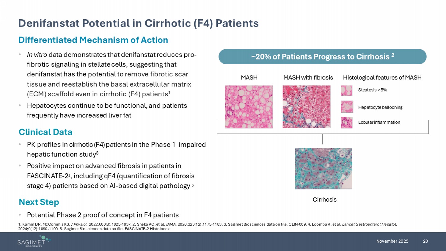 20 November 2025 Differentiated Mechanism of Action • In vitro data demonstrates that denifanstat reduces pro - fibrotic signaling in stellate cells , suggesting that denifanstat has the potential to remove fibrotic scar tissue and reestablish the basal extracellular matrix ( ECM ) scaffold even in cirrhotic (F4) patients 1 • Hepatocytes continue to be functional, and patients frequently have increased liver fat Clinical Data • PK profiles in cirrhotic (F4) patients in the Phase 1 impaired hepatic function study 3 • Positive impact on advanced fibrosis in patients in FASCINATE - 2 4 , including qF4 (quantification of fibrosis stage 4) patients based on AI - based digital pathology 5 Next Step • Potential Phase 2 proof of concept in F4 patients Denifanstat Potential in Cirrhotic (F4) Patients ~20% of Patients Progress to Cirrhosis 2 MASH MASH with fibrosis Histological features of MASH Steatosis > 5% Hepatocyte ballooning Lobular inflammation Cirrhosis 1. Kamm DR, McCommis KS. J Physiol. 2022;600(8):1825 - 1837. 2. Sheka AC, et al. JAMA. 2020;323(12):1175 - 1183 . 3. Sagimet Biosciences data on file. CLIN - 009. 4. Loomba R, et al. Lancet Gastroenterol Hepatol. 2024;9(12):1090 - 1100. 5. Sagimet Biosciences data on file. FASCINATE - 2 HistoIndex .