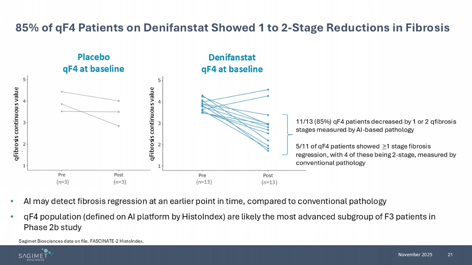 21 November 2025 85% of qF4 Patients on Denifanstat Showed 1 to 2 - Stage Reductions in Fibrosis • AI may detect fibrosis regression at an earlier point in time, compared to conventional pathology • qF4 population (defined on AI platform by HistoIndex ) are likely the most advanced subgroup of F3 patients in Phase 2b study (n=3) (n=3) (n=13) (n=13) Placebo qF4 at baseline Denifanstat qF4 at baseline qFibrosis continuous value qFibrosis continuous value 11/13 (85%) qF4 patients decreased by 1 or 2 qfibrosis stages measured by AI - based pathology 5/11 of qF4 patients showed > 1 stage fibrosis regression, with 4 of these being 2 - stage, measured by conventional pathology Sagimet Biosciences data on file. FASCINATE - 2 HistoIndex .