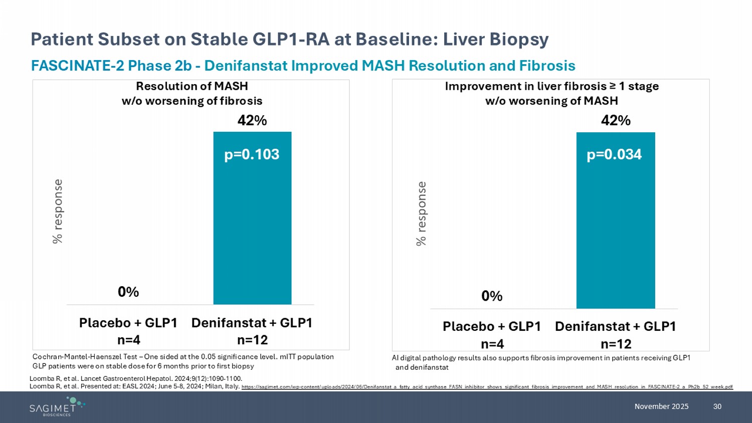 30 November 2025 Patient Subset on Stable GLP1 - RA at Baseline: Liver Biopsy Cochran - Mantel - Haenszel Test – One sided at the 0.05 significance level. mITT population GLP patients were on stable dose for 6 months prior to first biopsy FASCINATE - 2 Phase 2b - Denifanstat Improved MASH Resolution and Fibrosis Resolution of MASH w/o worsening of fibrosis Improvement in liver fibrosis ≥ 1 stage w/o worsening of MASH 0% 42% Placebo + GLP1 n=4 Denifanstat + GLP1 n=12 % response 0% 42% Placebo + GLP1 n=4 Denifanstat + GLP1 n=12 % response p=0.034 p=0.103 AI digital pathology results also supports fibrosis improvement in patients receiving GLP1 and denifanstat Loomba R, et al. Lancet Gastroenterol Hepatol. 2024;9(12):1090 - 1100. Loomba R, et al. Presented at: EASL 2024; June 5 - 8, 2024; Milan, Italy. https://sagimet.com/wp - content/uploads/2024/06/Denifanstat_a_fatty_acid_synthase_FASN_inhibitor_shows_significant_fibrosis_impro vement_and_MASH_resolution_in_FASCINATE - 2_a_Ph2b_52_week.pdf