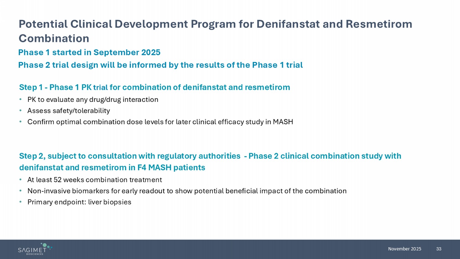 | · | In September 2025, Sagimet dosed the first participants in a Phase 1 pharmacokinetic (PK) trial of a combination of its oral once-daily fatty acid synthase (FASN) inhibitor, denifanstat, and a thyroid hormone receptor beta (THR-β) agonist, resmetirom. |