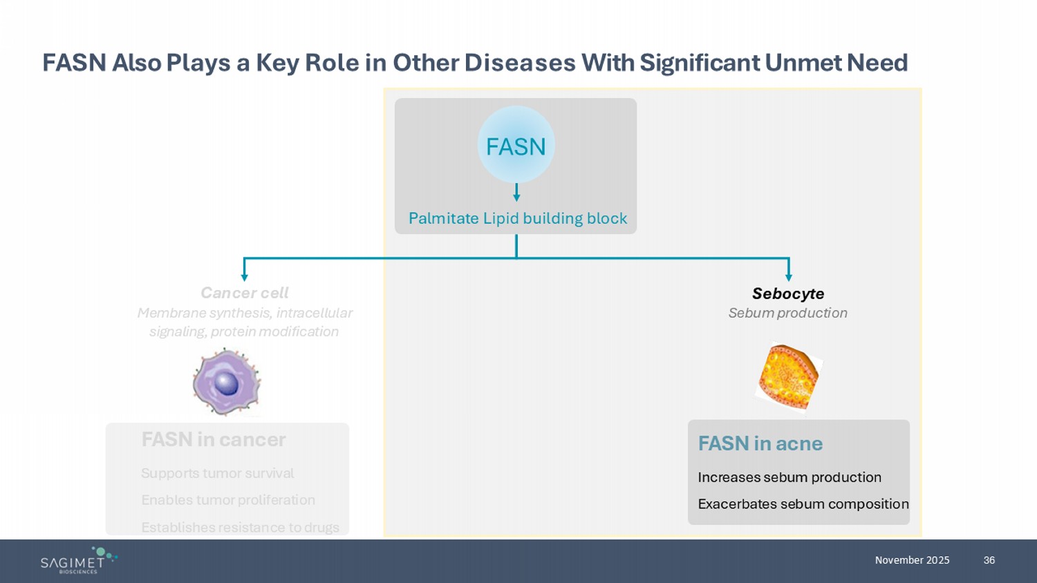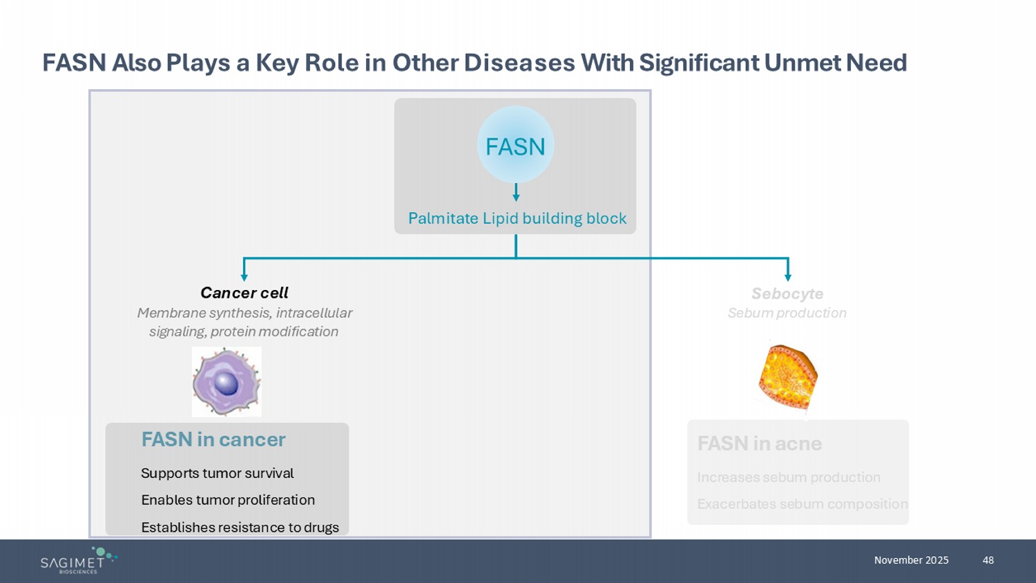 48 November 2025 FASN Also Plays a Key Role in Other Diseases With Significant Unmet Need FASN in cancer Supports t umor survival Enables t umor proliferation Establishes r esistance to drugs FASN in acne Increases sebum production Exacerbates sebum composition Cancer cell Membrane synthesis, intracellular signaling, protein modification Sebocyte Sebum production Palmitate Lipid building block FASN