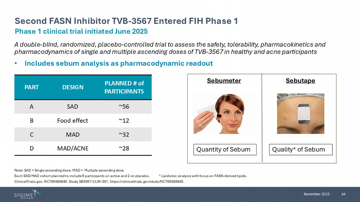 44 November 2025 A double - blind, randomized, placebo - controlled trial to assess the safety, tolerability, pharmacokinetics and pharmacodynamics of single and multiple ascending doses of TVB - 3567 in healthy and acne participants • Includes sebum analysis as pharmacodynamic readout Note: SAD = Single ascending dose. MAD = Multiple ascending dose Each SAD/MAD cohort planned to include 6 participants on active and 2 on placebo. * Lipidomic analysis with focus on FASN - derived lipids. ClinicalTrials.gov. NCT06989840. Study SB3567 - CLIN - 001. https://clinicaltrials.gov/study/NCT06989840. Phase 1 clinical trial initiated June 2025 Second FASN Inhibitor TVB - 3567 Entered FIH Phase 1 Sebutape Sebumeter Quantity of Sebum Quality* of Sebum PLANNED # of PARTICIPANTS DESIGN PART ~56 SAD A ~12 Food effect B ~32 MAD C ~28 MAD/ACNE D