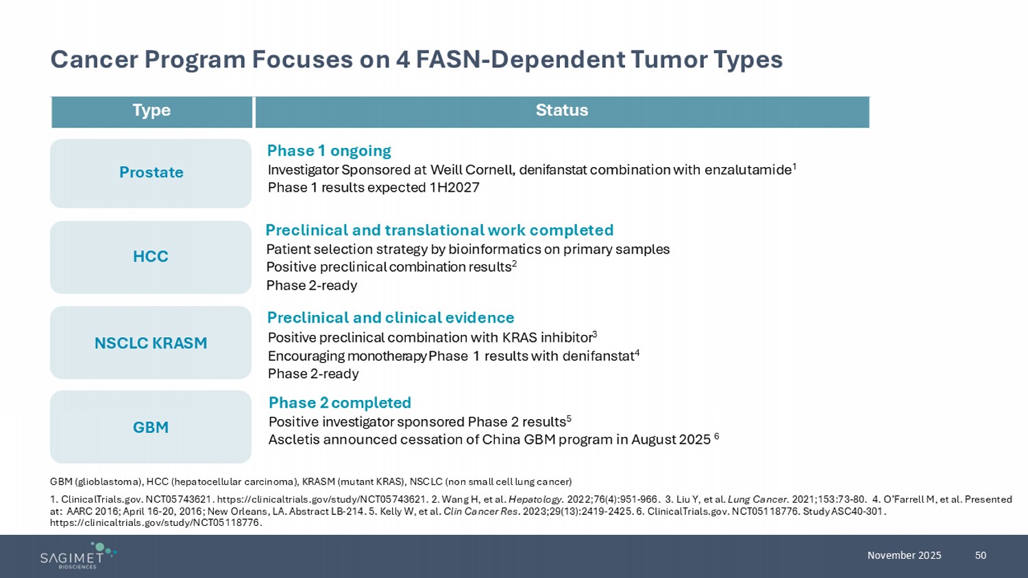 50 November 2025 GBM Prostate HCC NSCLC KRASM Cancer Program Focuses on 4 FASN - Dependent Tumor Types GBM (glioblastoma), HCC (hepatocellular carcinoma), KRASM (mutant KRAS), NSCLC (non small cell lung cancer) 1. ClinicalTrials.gov. NCT05743621. https://clinicaltrials.gov/study/NCT05743621 . 2. Wang H, et al. Hepatology. 2022;76(4):951 - 966. 3. Liu Y, et al. Lung Cancer . 2021;153:73 - 80. 4. O’Farrell M, et al. Presented at: AARC 2016; April 16 - 20, 2016; New Orleans, LA. Abstract LB - 214. 5. Kelly W, et al. Clin Cancer Res. 2023;29(13):2419 - 2425. 6. ClinicalTrials.gov. NCT05118776. Study ASC40 - 301. https://clinicaltrials.gov/study/NCT05118776. Phase 2 completed Positive investigator sponsored Phase 2 results 5 Ascletis announced cessation of China GBM program in August 2025 6 Status Type Phase 1 ongoing Investigator Sponsored at Weill Cornell, denifanstat combination with enzalutamide 1 Phase 1 results expected 1H2027 Preclinical and translational work completed Patient selection strategy by bioinformatics on primary samples Positive preclinical combination results 2 Phase 2 - ready Preclinical and clinical evidence Positive preclinical combination with KRAS inhibitor 3 Encouraging monotherapy Phase 1 results with denifanstat 4 Phase 2 - ready