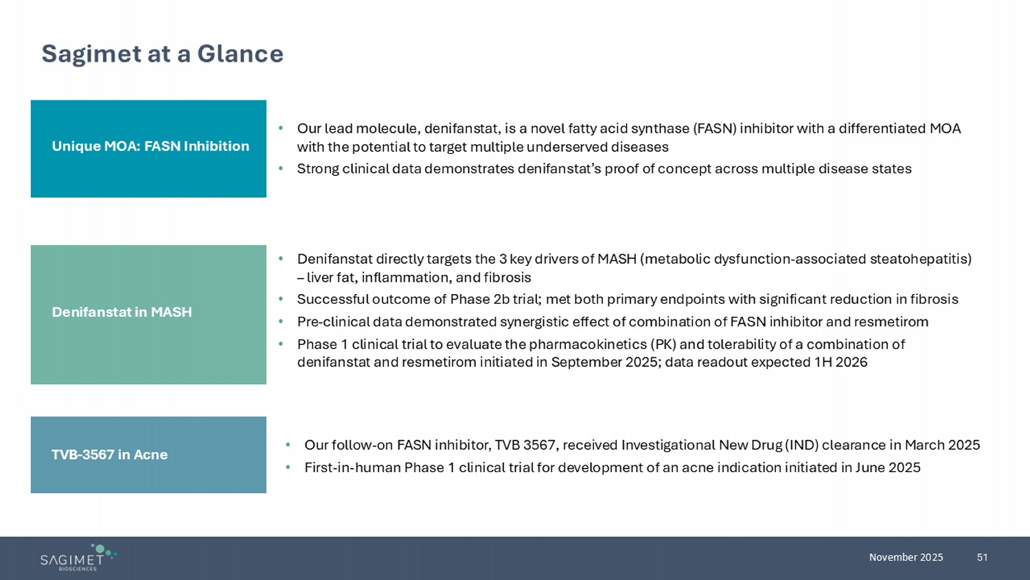 4 November 2025 Sagimet at a Glance • Our lead molecule, denifanstat, is a novel fatty acid synthase (FASN) inhibitor with a differentiated MOA with the potential to target multiple underserved diseases • Strong clinical data demonstrates denifanstat’s proof of concept across multiple disease states Unique MOA: FASN Inhibition • Denifanstat directly targets the 3 key drivers of MASH (metabolic dysfunction - associated steatohepatitis) – liver fat, inflammation, and fibrosis • Successful outcome of Phase 2b trial; met both primary endp oints with significant reduction in fibrosis • Pre - clinical data demonstrated synergistic effect of combination of FASN inhibitor and resmetirom • Phase 1 clinical trial to evaluate the pharmacokinetics ථ (PK) and tolerability of a co mbination of denifanstat and resmetirom initiated in September 2025 ; data readout expected 1H 2026 Denifanstat in MASH TVB - 3567 in Acne • Our follow - on FASN inhibitor, TVB 3567, received Investigational New Drug (IND) clearance in March 2025 • First - in - human Phase 1 clinical trial initiated in June 2025 for development of an acne indication